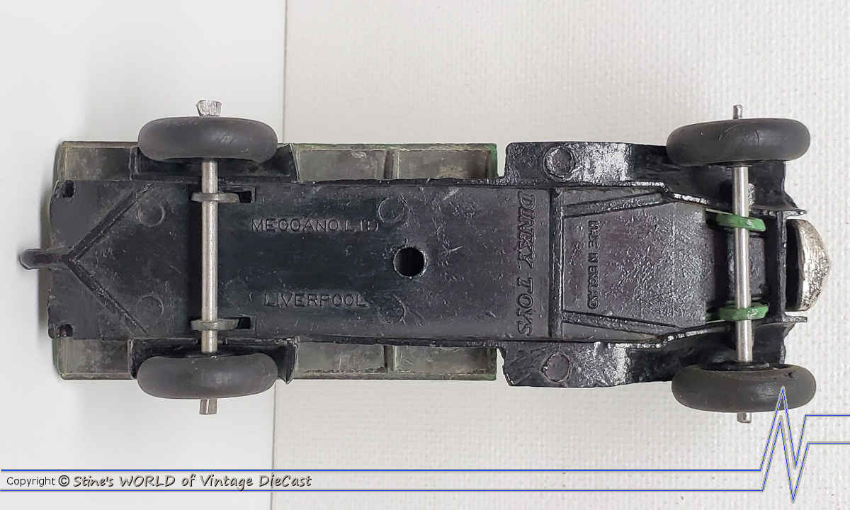 The Dinky #25c Flat Bed Wagon/ Truck is a pre-war model issued as early as 1935 and was available in many different body colours and baseplate configurations over its manufacturing lifespan. Four variations of the baseplates were issues with early models having open spaces and later versions having a solid baseplate.