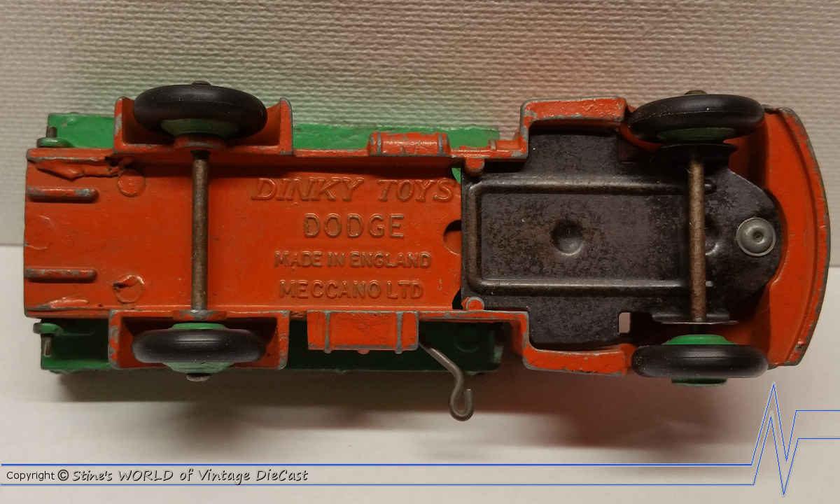 The Dodge Rear Tipping Wagon was introduced in 1950 and subsequently renumbered to 414 in 1954. This model was available in many different body colours and combination cab and chassis colours including orange, brown, blue, green and red. A handle on the side would allow the rear load to lift providing realistic action. Note, the #414 typically showed the model number on the wagon underside.