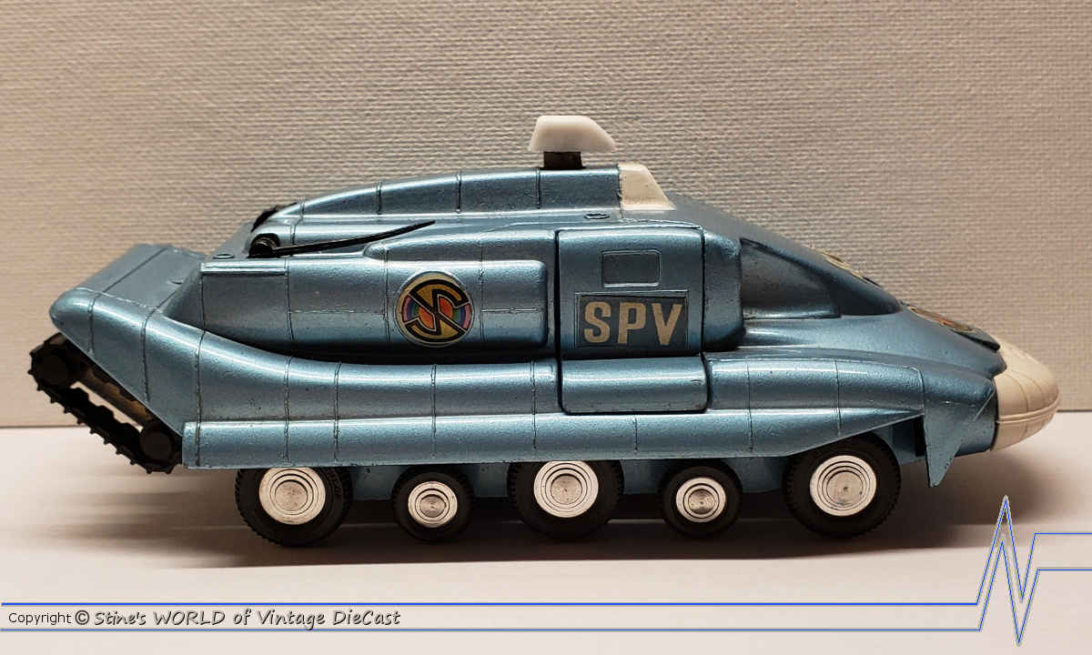 There was a lot of moving parts and hours of enjoyment with Captain Scarlet’s Spectrum Pursuit Vehicle. The side door could open to reveal Captain Scarlet suspended in his driver chair, antennas moved and rear tires can lower are some of the interesting features of this model that was available in a metallic blue body. This was not the first model #104 that Dinky used in their manufacturing identification. The original Dinky #104 model was the Aston Martin.