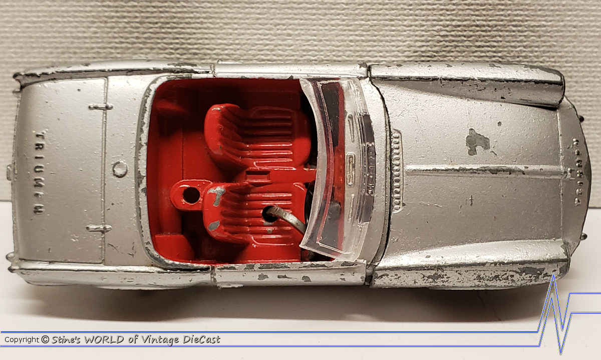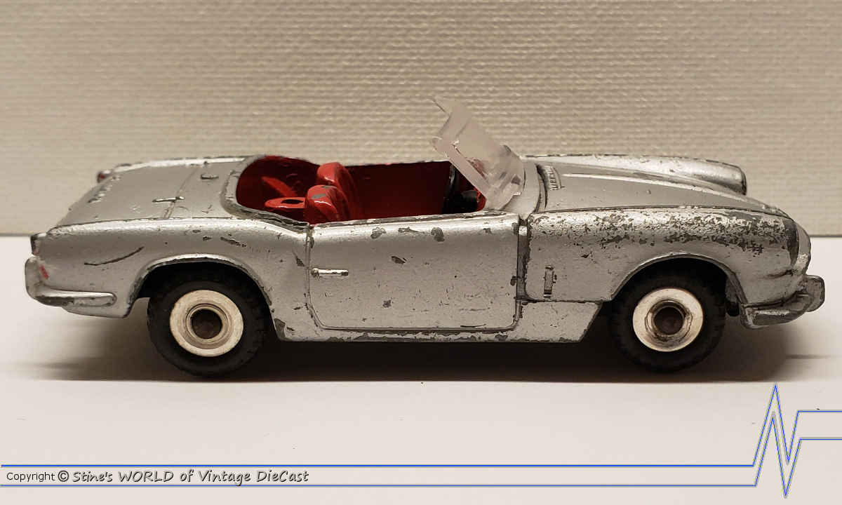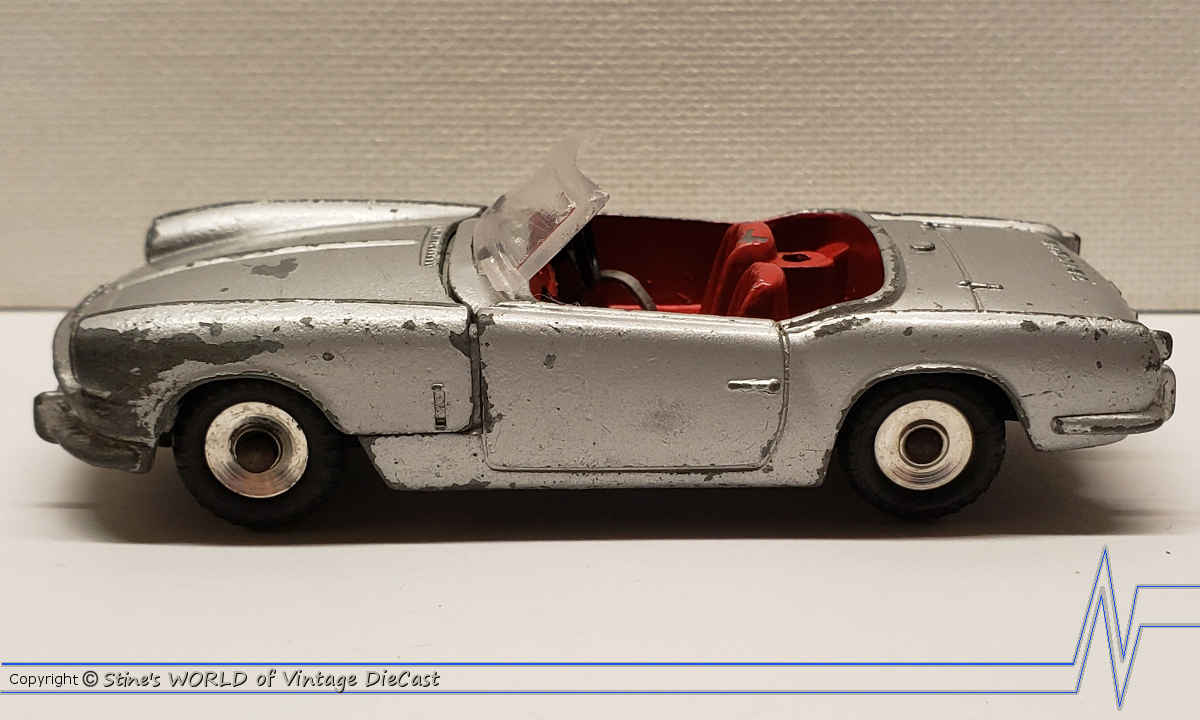 The Triumph Spitfire was introduced in 1963. The most popular body colours for the Dinky # 114 was silver or gold with red and purple being more difficult to find. This model came with a removable driver that was secured with a seatbelt and spun hubs. The plastic windshield was often broken with rough play.