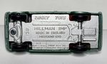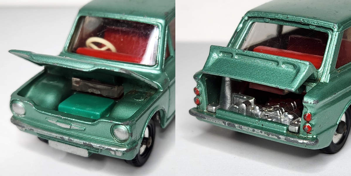 The Hillman Imp car was introduced in 1963 and was available in several metallic body colours including blue, green, and red. This was a model from the 1960s with spun hubs. The hood and truck can open to reveal the engine and trunk space. This model also included a Briefcase stored in the hood. Notice that the engine is in the rear.