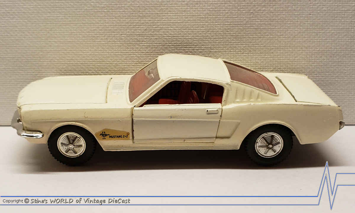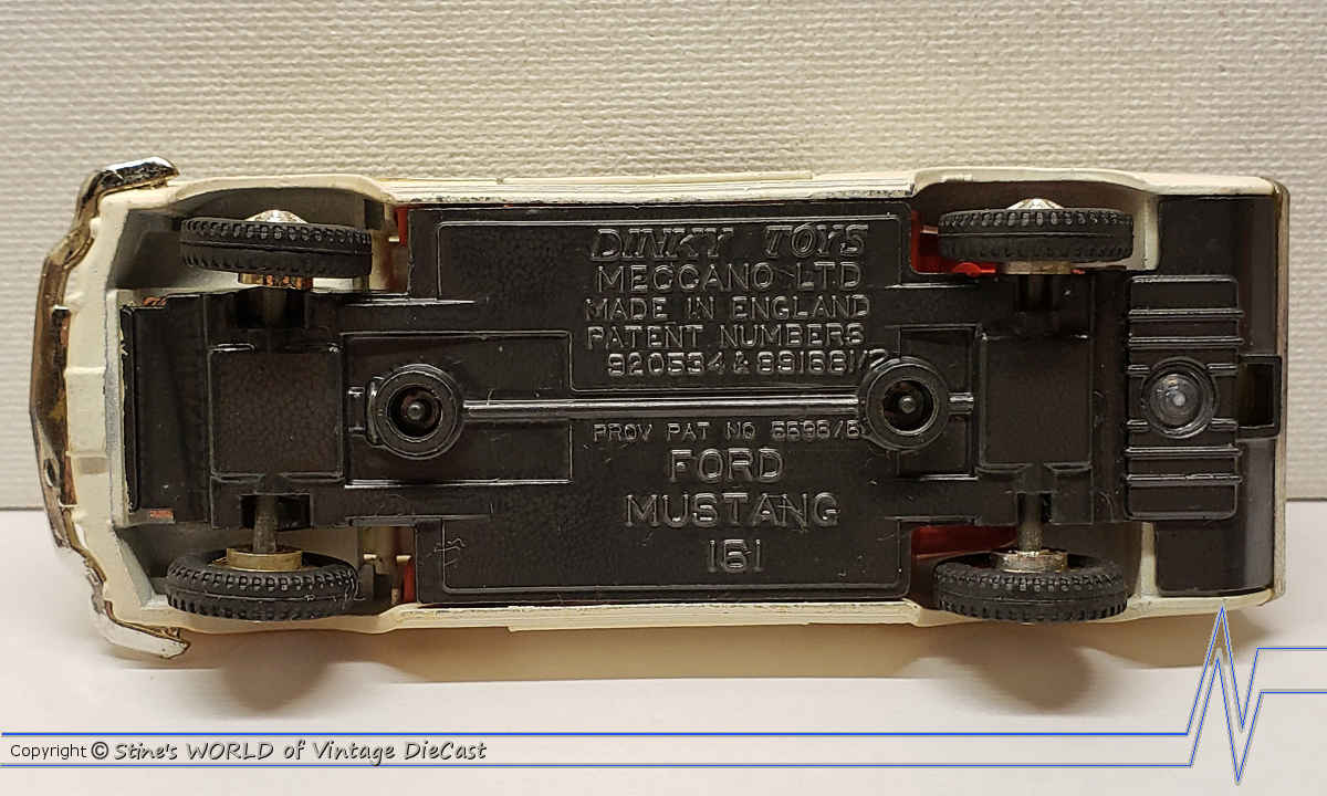 The Ford Mustang Fastback was introduced in 1965 and was available in a white or yellow body with beautiful realist chrome looking hubs. This was not the first model #161 that Dinky used in their manufacturing identification. The original Dinky #161 model was the Austin Somerset.