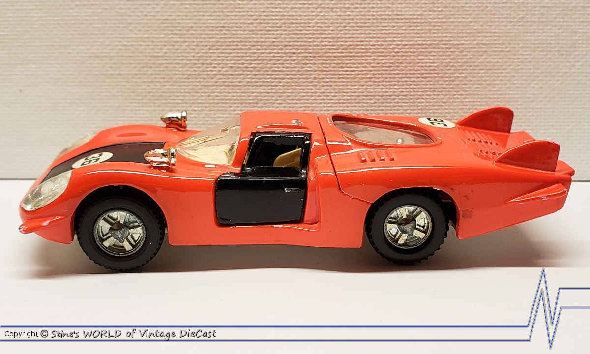 The Alfa Romeo 33 Tipo was introduced in 1971 and was packaged in a hard rigid plastic case. This model came in either a red (with black doors and front hood) or blue body colour with cast hubs.