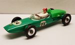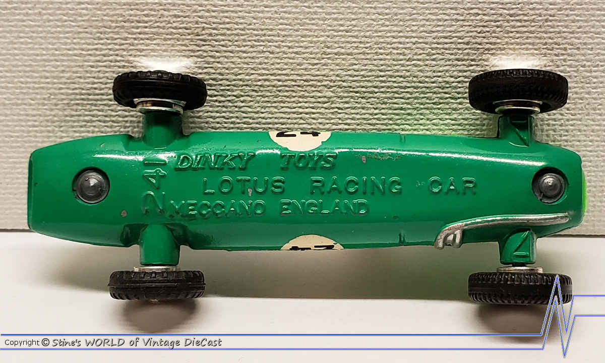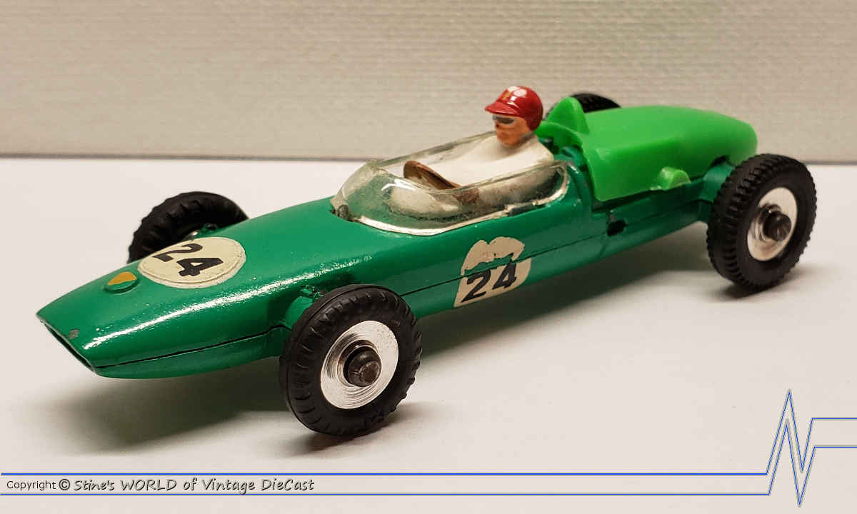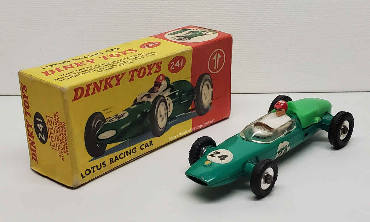 The Lotus Racing Car as introduced in 1963 as part of the new racing series that included the Dinky #240 Cooper, #241 Lotus, #242 Ferrari and the #243 BRM. The Lotus was only available in a green body colour with the number 24 or 7 racing decals and spun hubs.
