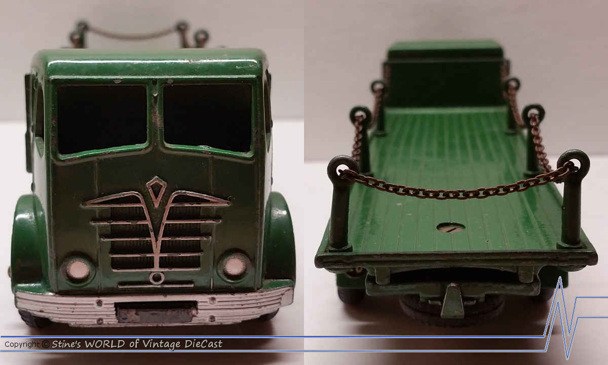 The Foden Flat Truck was introduced in 1952 and subsequently renumbered to 905 in 1954. This model came in a green and red with later versions in blue and two-tone. There were two types of grilles used on the cab. The chain added realism to the model and usually broke and was lost. Commonly, one or two posts on the flat bed were missing as they often broke-off with rough play.