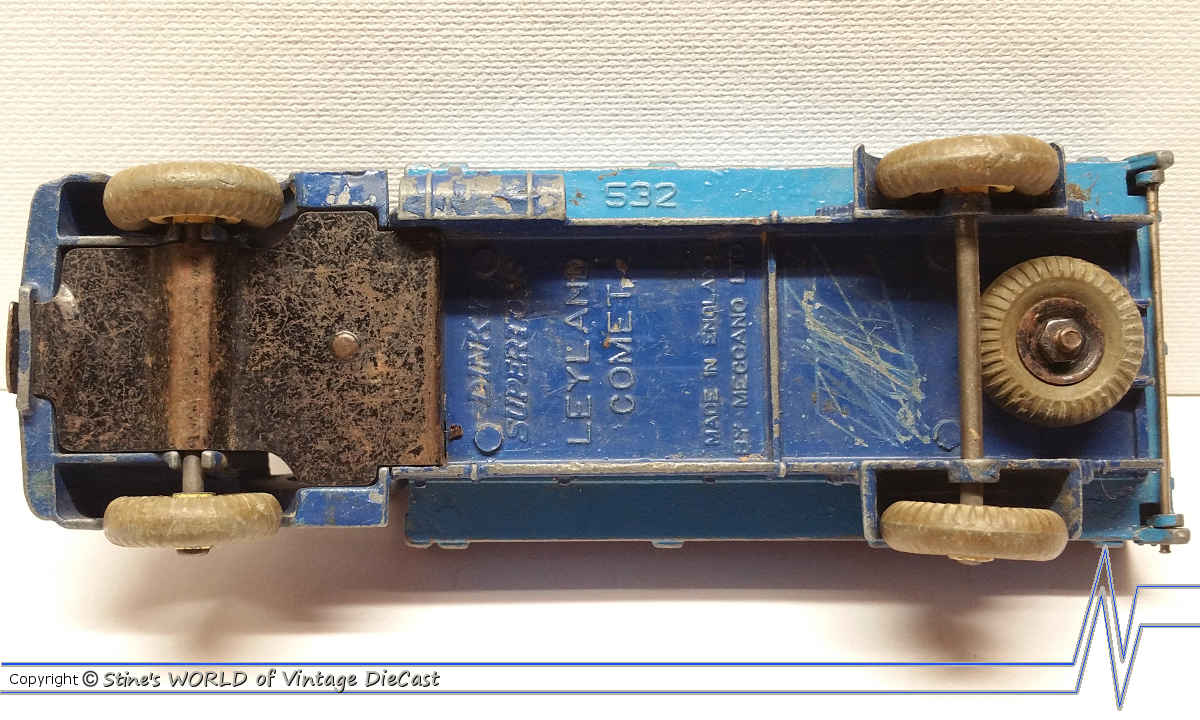 This model was available in many solid body colours and cab/tipper combinations including blue, green, red and orange. The tailboard was hinged so that it would open and close. The model numbers were usually displayed on the bottom of the tipper load with minor casting changes. Note the #418 showed “DINKY TOYS” and the #532 had “DINKY SUPERTOYS” on the cast base.