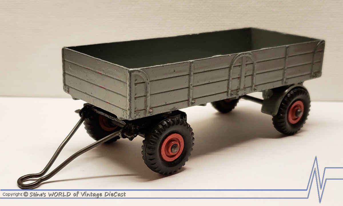 The Large Trailer was introduced in 1948 as part of Dinky’s Farm series. The early versions were available in a grey body colour with either black or red hubs. Later version introduced other colours including red and yellow. Some versions of this model included the identifier on the front axle.